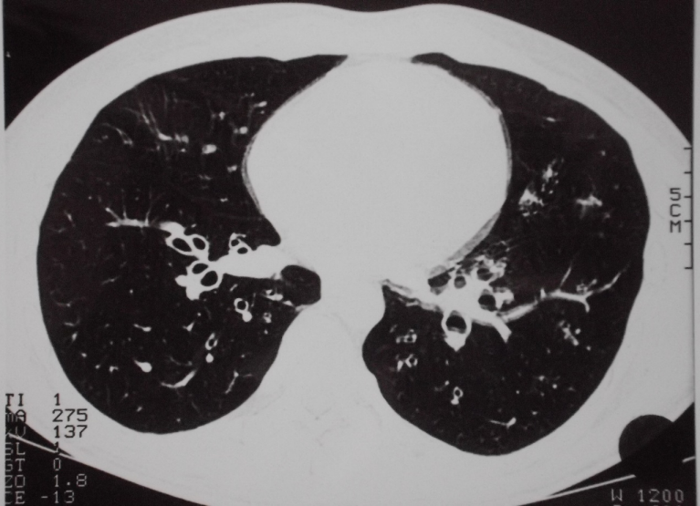 A very characteristic finding in patients with UC is bronchiectasis, which can be diagnosed clinically by mass sputum expectoration or by X-ray, today mainly by CT [1], [2], [4], [5], [6], [8], [19]. Using HRCT, Mahadeva found 13 out of 14 patients with UC to have bronchiectasis [15]. With these data it is obvious that a particular relation exists between bronchitis and colitis in form of a distinct syndrome. The bronchial involvement can take place before the clinical outbreak of UC, but mostly thereafter, with or without a corresponding clinical activity of UC. Therapeutic interventions as IBD modifying drugs or colectomy have no controlling effect of the respiratory manifestations [9], [32], but it is reported that the bronchial alterations respond to corticosteroids [36], as holds true also in our case.