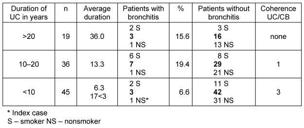 We formed 3 groups according to the duration of UC. The proportion of bronchial involvement was greater in those patients with long lasting UC. Smokers were found in all groups with and without bronchitic complaints. The proportion of bronchial symptoms in relation to UC was more evident in the patients with a shorter duration of UC. All 3 patients in the group III reported an exacerbation of the bronchial impairment simultaneously with an exacerbation of UC. The patient in group III who was non-smoker was the one presented above with a most severe tracheobronchitis.