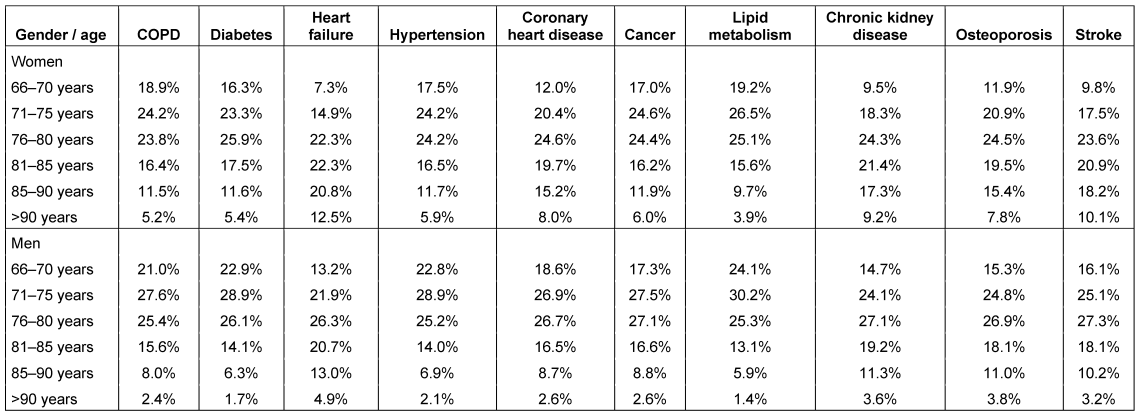 Ergebnisse: Alle untersuchten Diagnosen waren häufig bei älteren Patienten. Am häufigsten wurde die Hypertonie diagnostiziert (65,7% der Männer und 66,1% der Frauen). Am seltensten war die Schlaganfall-Diagnose (6,6% der Männer und 5,1% der Frauen). 57,7% der Männer und 59,3% der Frauen hatten zwischen zwei und drei unterschiedliche chronische Erkrankungen; ca. 25% hatten vier oder mehr der untersuchten Diagnosen.