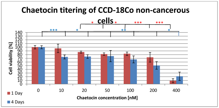 CCD-18Co is a non-cancerous cell line originated from the human colon. This cell line is used to test the cytotoxic effects of chaetocin on non-cancerous cells in order to compare it with the effects on ccRCC cell lines. Figure 3 [Fig. 3] shows the results of the MTT test for non-cancerous colon cells that were incubated with different concentrations of chaetocin. The cell viability stays above 80% until a concentration of 200 nM is reached. Incubation with 200 nM chaetocin results in the death of 28% while a concentration of 400 nM kills 91% of the cells when incubated for 24h. Four days of incubation resulted in a drop of cell viability to 73% after administration of 10 nM chaetocin. The next drop in cell viability is observed at 100 nM where 66% of the cells were still alive while it was only 50% for 200 nM of chaetocin. The final concentration of 400 nM resulted in 21% cell viability which is more than twice the viability of the samples that were incubated for one day.