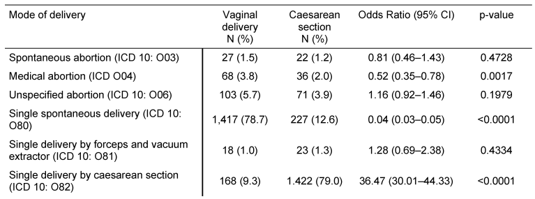 Table 1 [Tab. 1] displays mode of delivery in women with prior CS or VD in German gynecological practices. The study included 1,801 women with CS and 1,801 women with VD. Medical abortion and single spontaneous delivery were significantly less frequent in women with CS than in women with VD (OR=0.52, 95% CI: 0.35–0.78; and OR=0.04, 95% CI: 0.03–0.05), whereas CS was more common (79.0% versus 9.3%, OR=36.47, 95% CI: 30.01–44.33). Unspecified abortion and single delivery by forceps and vacuum extractor did not differ between the two groups (p-values equal to 0.1979 and 0.4334 respectively).