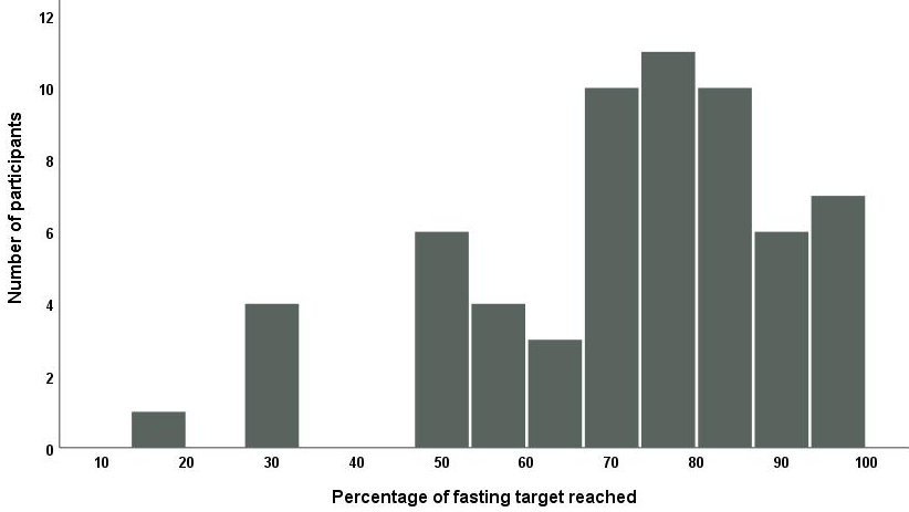 On average, participants were able to reach the fasting goal of 15–16 hours in 72.2±18.9% of all recorded days (Figure 1 [Fig. 1]). There was considerable heterogeneity between participants regarding the individual percentage of reaching the fasting goal from 16.9% up to 97.7%.