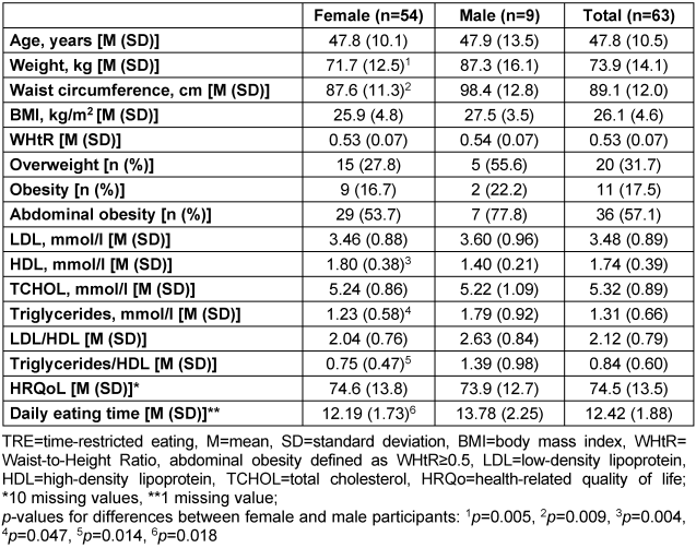 Of the 63 participants included, two discontinued the study during its course due to illness and occupational stress; their follow-up data are missing. Two other participants were unable to maintain the restricted 8–9 hours of food intake due to incompatibility with family eating habits and illness, but continued the diary and participated in the final examination.