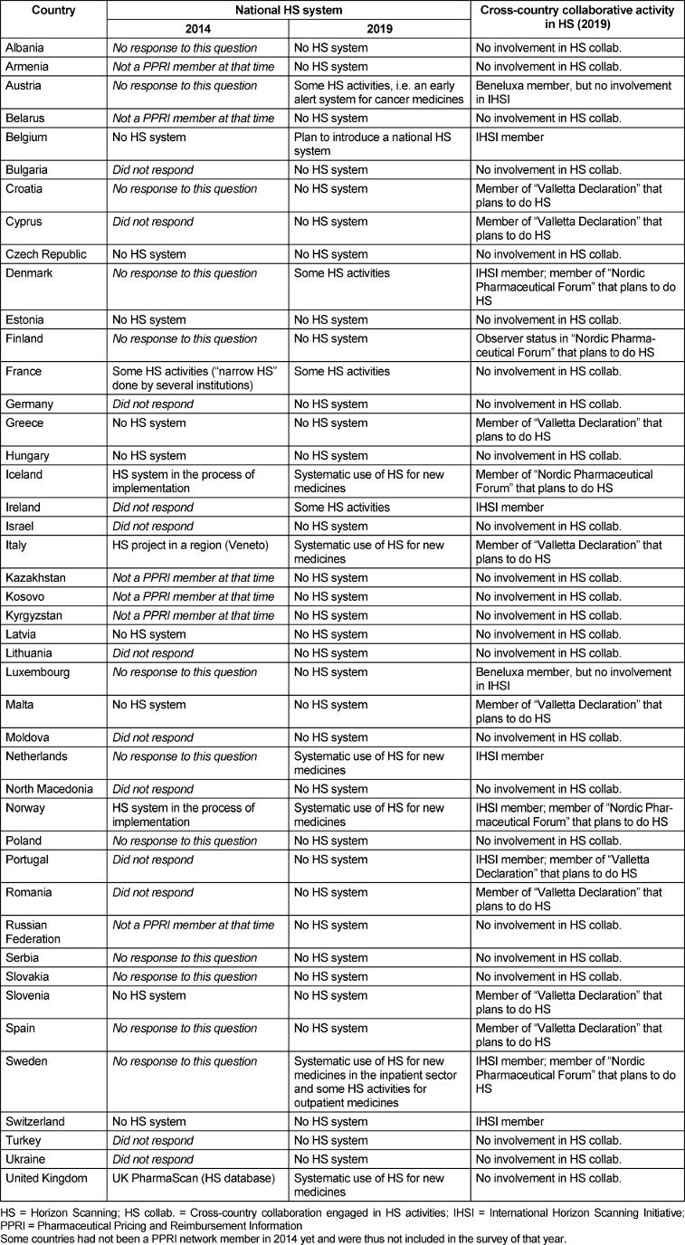 Surveys addressing officials in authorities responsible for pharmaceutical pricing and reimbursement in European countries were conducted at two points in time to learn whether or not (advanced) horizon scanning systems for medicines were in place. In 2014 and in 2019, members of the Pharmaceutical Pricing and Reimbursement Information (PPRI) network were addressed to participate in a survey. Both surveys were part of a larger questionnaire that studied further pricing and reimbursement policies for medicines. PPRI is a network of representatives of competent authorities for pharmaceutical pricing and reimbursement of medicines in mainly European countries [28]. At the time of the 2019 survey, the PPRI network comprised 47 countries, thereof the then 28 Member States of the European Union (EU), 16 further countries in the WHO European region (Albania, Armenia, Belarus, Iceland, Israel, Kazakhstan, Kosovo, Kyrgyzstan, Moldova, North Macedonia, Norway, Serbia, Russian Federation, Switzerland, Turkey and Ukraine) and three non-European countries (Canada, South Africa and South Korea). In 2014, the PPRI network comprised 42 countries, thereof 39 countries in the European region. As the study was targeted at European countries, the three countries which are not situated in the European region were excluded from this study. 26 of the then 38 PPRI countries in the European region responded to a questionnaire on policies in 2014, and 14 of them answered the question on horizon scanning. For the second survey of December 2019 with the then 44 PPRI countries in the European region, a slightly different methodology was applied. We prefilled a questionnaire with information that PPRI network members had provided and validated in a 2018 survey, and we asked for validation. 26 countries validated the 2019 data, while for the remaining 18 countries, validated information relating to the year 2018 is available.