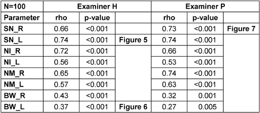 All correlation coefficients were positive, with values ranging from 0.27 to 0.74, indicating that both parameters tended to show the same orientation. In particular, longer distances tended to be estimated longer, while shorter distances tended to be estimated shorter. All correlations were significant (p<0.05). The highest and lowest correlation coefficients were noted in the distance from the sternal notch to the nipple (rho=0.66–0.74) and the breast width (rho=0.27–0.43), respectively. There were no clear or consistent differences between both examiners and between the left and right sides of the breasts. Figure 5 [Fig. 5], Figure 6 [Fig. 6] and Figure 7 [Fig. 7] display three out of the 16 correlations.