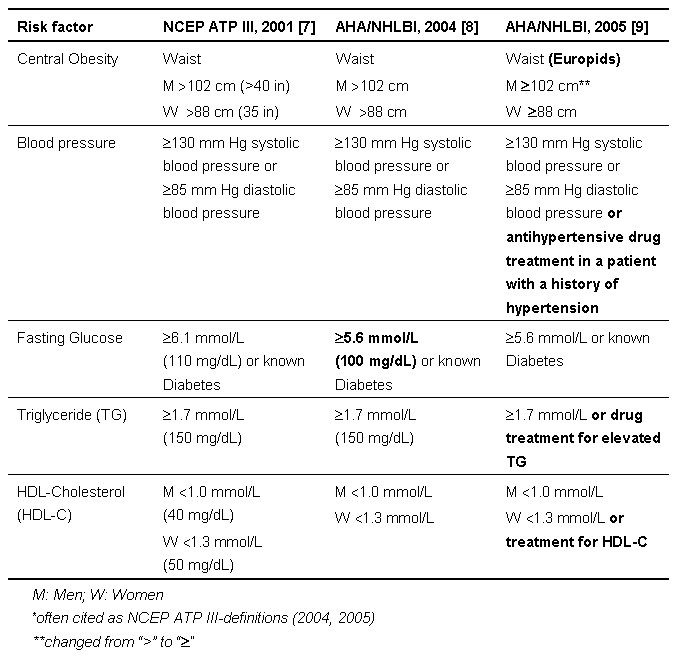[9] Grundy SM, Cleeman JI, Daniels SR, Donato KA, Eckel RH, Franklin BA, Gordon DJ, Krauss RM, Savage PJ, Smith SC Jr, Spertus JA, Costa F; American Heart Association; National Heart, Lung, and Blood Institute. Diagnosis and management of the metabolic syndrome: an American Heart Association/National Heart, Lung, and Blood Institute Scientific Statement. Circulation. 2005;112(17):2735-52.