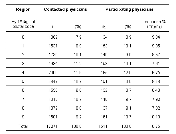 The number of GPs in each stratum (10 postal regions identified by the first digit of the postal code) was proportional to the number in the address base. In the pre-study, physicians’ response and participation were not systematically related to region, age or sex, and therefore potential non-response bias appeared to be unlikely.