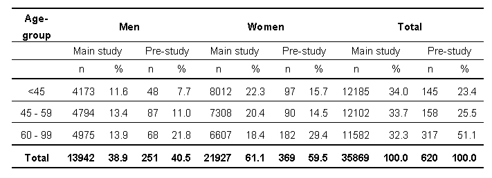 Calculations for determination of the study population size were based on basic assumptions (as outlined below), on results and experiences of the pre-study, and on the strategy of recruitment. The sample size calculation was aimed to get even numbers of patients in six strata defined by sex and age group (<45 years, 45-59 years and ≥60 years of age).