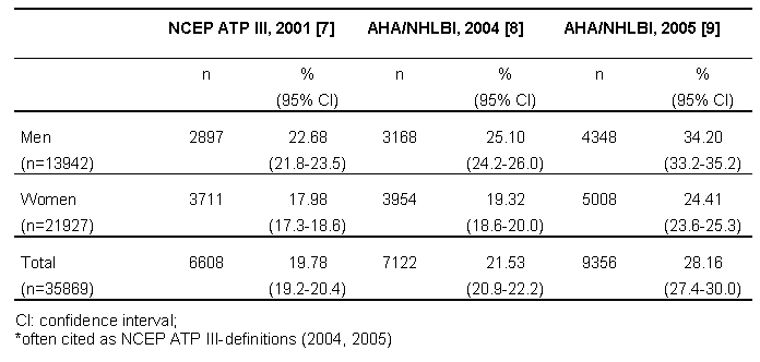 Since this study was conducted in October 2005, the study protocol and study material had to be finished in the beginning of 2005, half a year before the release of the IDF- and updated AHA/NHLBI-definitions. For this reason the most widely used NCEP ATP III-definition was chosen here to estimate the MetSyn as primary outcome variable. Nevertheless in secondary analysis it is planned to calculate and compare the different definitions published recently.