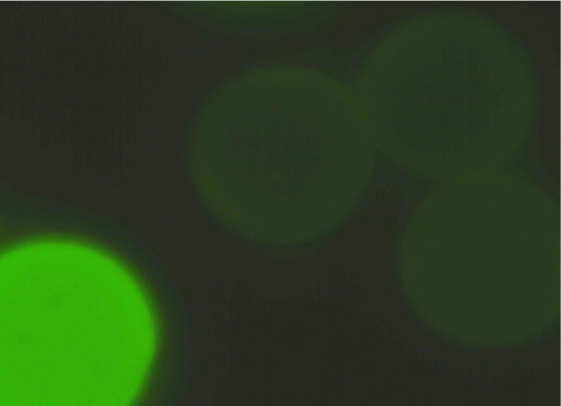 Figure 4: Amino-derived TOYOPEARL HW 75F® particles treated with periodate and subsequently reacted with fluorescamine. One particle that was not treated with periodate is shown as impurity to demonstrate the contrast to the bulk of particles that do not exhibit fluorescence. Magnification x100