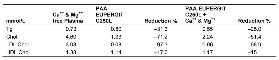 Table 7: Adsorption of lipoproteins from Ca++ and Mg++ free citrated plasma by PAA-Eupergit C250L and by PAA-Eupergit C250 preloaded with Ca++ and Mg++