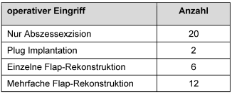 Zum Follow-up nach 6 Monaten war die Heilung bei 20 von 40 Patienten (50,0%) eingetreten. Ein Patient mit Morbus Crohn, bei dem die Fistel nach 6 Monaten verheilt war, zeigte später einen Re-Abszess mit Fistelpersistenz. Drei weitere Patienten, die in der Ambulanz weiterhin vorstellig wurden, erzielten eine komplette Heilung nach 7, 9 bzw. 12 Monaten. Vor diesem Hintergrund konnte letztendlich eine Heilung bei 22 von 40 Patienten (57,5%) erzielt werden. Es bestand eine große Differenz der Heilungsrate zwischen den einzelnen Chirurgen zwischen 0 und 75% (Tabelle 1 [Tab. 1]). Ein anderer Unterschied zeigte sich bezüglich vorausgegangener chirurgischer Interventionen (Tabelle 1 [Tab. 1]). Nach lediglich stattgehabter Abszessexzision oder einfacher Pluginsertion heilten 14 von 22 Fisteln (63,6%). Nach ein- oder mehrfacher Flap-Rekonstruktion sank die Heilungsrate auf 50% (9/18). Bei Patienten, bei denen bis zu 4 Eingriffe vorausgegangen waren (einschließlich Abszessexzisionen), zeigte sich eine Heilungsrate von 66,7% (18 von 27). Nach mehr als 4 chirurgischen Eingriffen betrug die Heilungsrate lediglich 38,5% (5 von 13).