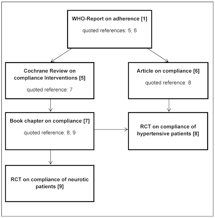 In the article by the WHO two references are given for this specific statement. The first one is a Cochrane Review on interventions to enhance patient compliance [5] and the second one is an article on improving patient compliance to antihypertensive regimes [6]. The statement in the Cochrane Review is: “Typical adherence rates for prescribed medications are about 50% with a range from 0% to over 100%“ [5]. But the statement doesn’t refer to chronic conditions or certain countries, as suggested by the WHO statement. In the other article it is stated that “only about half (...) taking (…) 80% or more of their (...) drugs” [6]. Both articles are not the original sources of the information, but refer to other references. The Cochrane Review refers to a chapter of a book on the magnitude of patient compliance published in 1979 [7] and the other article refers to a randomized controlled trial (RCT) conducted in 1975 [8]. The book chapter lists a great number of studies on compliance and persistence among others for long-term chronic conditions (12 studies), of which is deduced that “compliance with different long-term medication regimes for different illnesses in different settings converge to approximately 50% (…) when the estimation is not based on self-reports” (for a better understanding of citation way see Figure 1 [Fig. 1]). The adherence rates of listed studies are in a range between 33% and 94%. In consideration of the WHO’s definition of adherence and excluding “remaining in care” as adherence measure, finally two studies could be the potential basis of data for the WHO statement, originated from the Cochrane review. One of these two studies is a RCT on hypertensive steel workers in Canada published in 1975 (see above) [8], while the second study deals with neurotic outpatients in Pennsylvania, USA published in 1965 [9]. The adherence rates (proportion of adherent patients) are indeed 53% and 56% respectively. Apart from the fact that throughout the way of citation the original statement has changed like whispers down the lane, both studies are not suitable to assume such generalized adherence estimation.