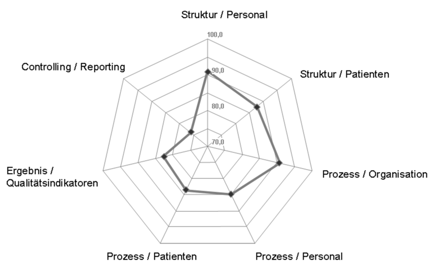 Abbildung 2: Netzdiagramm zur Darstellung der Ergebnisse der externen Fragebogenbewertung Die Punkte zeigen den mittleren Prozentsatz der maximal erreichbaren Punktwerte für eine Dimension. Alle Stationen mit kompletten Fragebögen (n=18) wurden ausgewertet. Der Fragebogen besteht aus 52 Fragen von denen jeder mit 1–4 Punkten bewertet wurde (siehe Methodenteil). Der Prozentsatz der maximal erreichbaren Punkte für jede Dimension wurde berechnet.