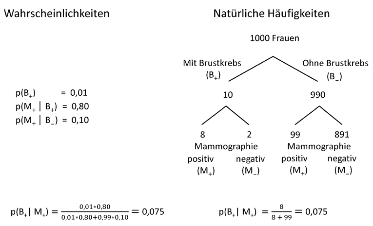 95 von 100 der befragten Ärzte schlossen aus diesen Informationen, dass die Wahrscheinlichkeit für Brustkrebs nach einem positiven Testergebnis zwischen 70 und 80 Prozent liegen würde. Setzt man die gegebenen Werte jedoch in die so genannte Bayes’sche Regel ein (linke Seite der Abbildung 1 [Abb. 1]), ergibt sich ein PPW von 7,5 Prozent! Diese Schwierigkeiten, aus den gegebenen Wahrscheinlichkeiten den richtigen PPW abzuleiten, konnten in diversen Studien mit Ärzten [5], Medizinstudenten [6] und medizinischen Laien [7] vielfach repliziert werden (für einen Überblick siehe [8]).