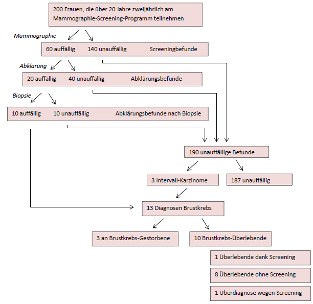 - Von diesen 20 Frauen stellt sich bei 10 Frauen der Verdacht als unbegründet heraus. 10 Frauen erhalten die Diagnose Brustkrebs im Screening. Von den übrigen 190 Frauen erhalten drei Frauen in den 20 Jahren zwischen zwei Screeningrunden ebenfalls die Diagnose Brustkrebs.