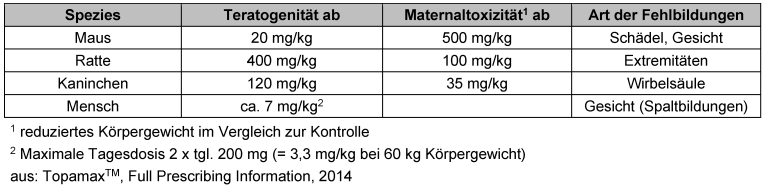 Seit Jahrzehnten ist die teratogene Wirkung vieler Antiepileptika beim Menschen bekannt. In der präklinischen Prüfung zeigte auch Topiramat ein teratogenes Potenzial bei drei Spezies (Maus, Ratte, Kaninchen). Allerdings treten diese Wirkungen bei sehr unterschiedlichen Dosierungen auf, die alle deutlich über den humantherapeutischen Dosierungen liegen. Die Befunde sind darüber hinaus schwierig zu interpretieren, weil gleichzeitig toxische Wirkungen am trächtigen Tier auftreten („Maternaltoxizität“). Unklar war daher zunächst, ob diese experimentellen Befunde für den Menschen bedeutsam sind (Tabelle 1 [Tab. 1]). Im North American Antiepileptic Drug Pregnancy Registry (NAAED) wurde in den Jahren nach der Zulassung jedoch eine Häufung von kindlichen Fehlbildungen beobachtet. Bei Kindern nach pränataler Topiramat-Exposition lag die Inzidenz für Lippen- bzw. Gaumenspaltbildungen bei 1,2%, für andere Antiepileptika wurde ein Wert von etwa 0,4 % errechnet, während die „normale“ Rate dieser Fehlbildung in der Bevölkerung bei etwa 0,1 % liegt [3]. Als Konsequenz wurden die Warnhinweise vor einer Einnahme während der Schwangerschaft verstärkt. Eine sorgfältige Nutzen-Risiko-Abwägung unter Berücksichtigung der Indikation muss im individuellen Fall erfolgen, wenn das Arzneimittel bei gebärfähigen Frauen eingesetzt wird.