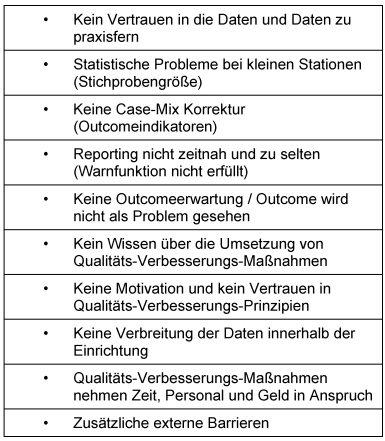 Evidenzbasierte Intensivmedizin sollte in ihrem Kern auf der Anwendung konsentierter Leitlinien und Empfehlungen beruhen, die sich in der neuesten Literatur wiederfinden. Die Implementierung dieser Leitlinien ist das eigentliche Ziel. Dies zu ermöglichen muss im Fokus der kommenden Jahre liegen. Neben innovativen Methoden der Leitlinienimplementierung wie „Blended Learning“-Konzepte (z.B. Onlineschulung kombiniert mit Simulatorschulungen und Supervisionen), Multiplikatorenschulungen [11] und Web-basierte Plattformen, ist die Überprüfung der Leitlinienanwendung durch QI ein wesentlicher Baustein. Auch wenn die QIs zunehmend Einzug halten, zeigen sich in der flächendeckenden regelmäßigen Anwendung noch Defizite. Ursachen hierfür können vielfältig sein und sind in Tabelle 1 [Tab. 1] [12] dargestellt.