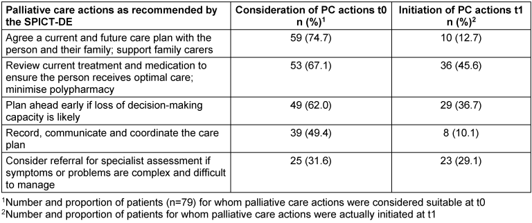 Table 4: Comparison of the consideration (t0) and initiation (t1) of PC actions as recommended by the SPICT-DE (n=79; multiple responses allowed)
