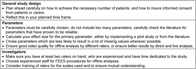 • Somewhat surprisingly, an unsatisfactorily low interrater reliability was found, despite the fact that both raters at that stage had already evaluated more than 2000 FEES. As a consequence, it might be helpful to train even highly experienced raters in a sense that more congruent results are achieved, even in questionable findings.
