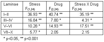 Table 1: F values obtained with two-way ANOVA on FLI for stress and non-stress groups and the three drug treatment (ipsilateral side)