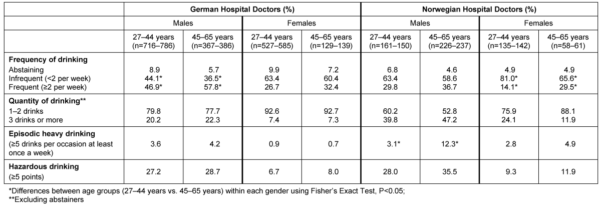 Independent of age group, gender and nationality, the majority of hospital doctors in Norway and Germany consumed alcoholic beverages, and they drank mostly at a non-hazardous level. Specifically the female doctors among them were found to have lower numbers of episodic heavy drinkers and hazardous drinkers. According to nationality, abstinence was more prevalent among German doctors. German doctors tended to frequently drink 1–2 drinks per occasion, and Norwegian doctors to infrequently drink 3–4 drinks per occasion. The percentage of episodic heavy or hazardous drinking was higher in the Norwegian than the German sample, except for the sub-group of male doctors aged 27–44 years, where the differences were minimal.