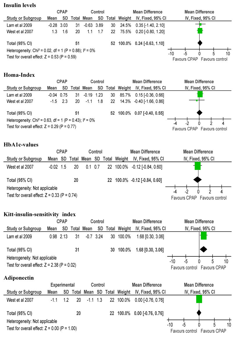 Das Poolen der Daten zeigte, dass eine CPAP-Therapie weder die Plasmainsulinspiegel, noch den Homaindex, die Adiponektinspiegel oder die HbA1c-Werte beeinflusst. Eine Studie berichtete über einen signifikant positiven Effekt der CPAP-Therapie auf den Insulinsensitivitätsindex (1,68%/min, 95% CI 0,3–3,06).