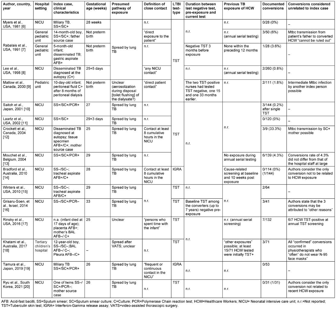 Of the 15 studies, 12 reported the exposure of healthcare workers in neonatal intensive units (NICUs) to premature infants born before the 37th week of pregnancy and who suffered from congenital pulmonary TB. One study [8] addressed possible pulmonary Mtbc transmission in a general pediatric ward including two infants, aged five and 14 months, as well as a 12-year-old boy [18].