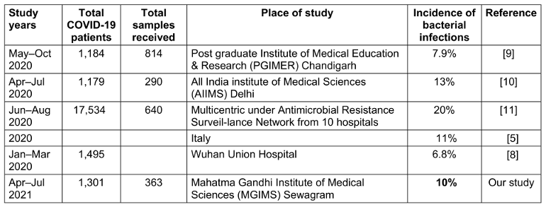 This was based on admission to ICU and hospital mortality. Out of 1301 total COVID-19 admissions during the second wave, 733 required (56%) ICU admission; of these, 90 (68.7%) were positive for bacterial infections. Overall mortality was 70 (5.4%) among 1,301 patients on the COVID-19 war and 7.6% among the 733 ICU patients.