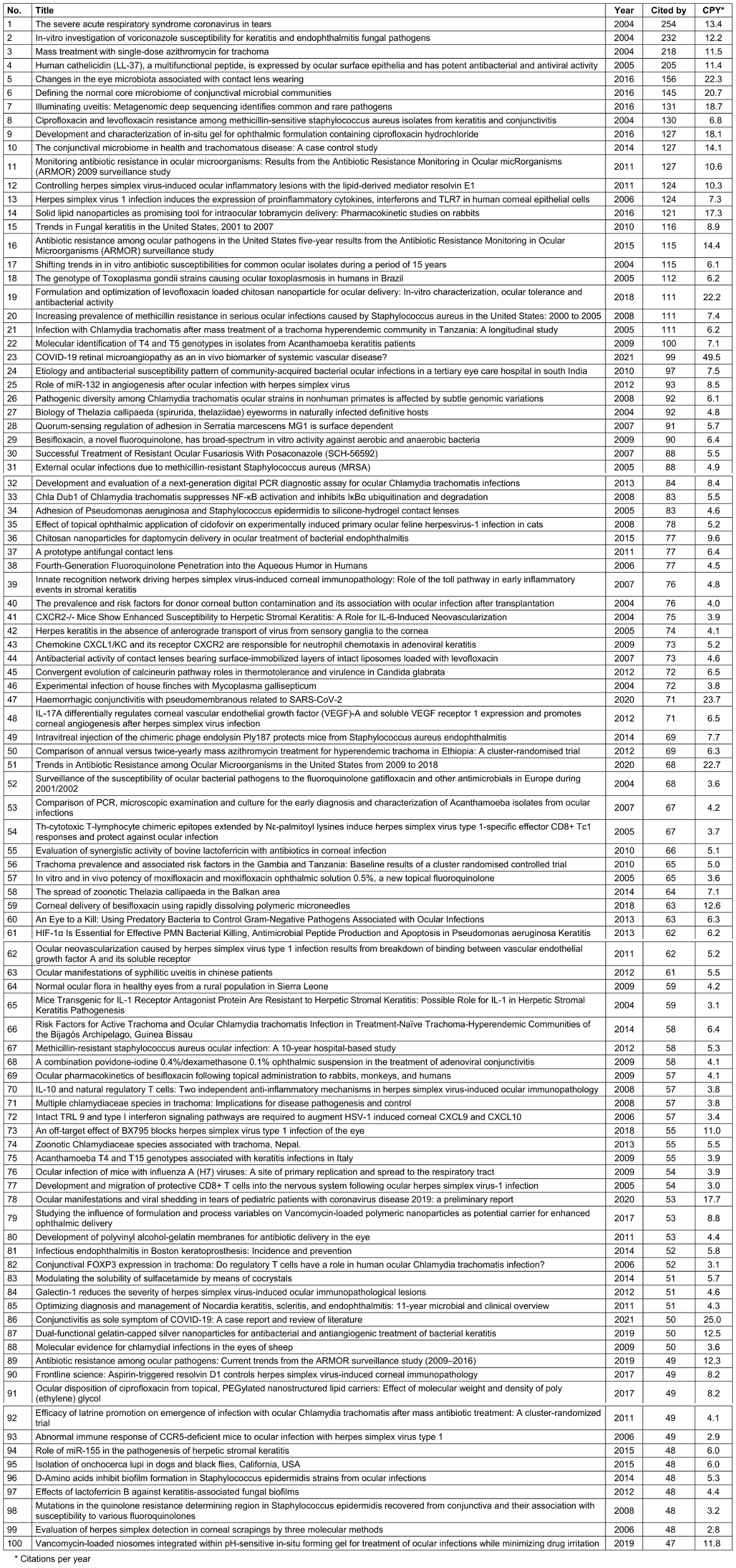 We conducted the bibliometric analysis to quantitatively analyze the characteristics of the 100 most-cited studies on ocular hygiene and infections, and to assess the interconnectedness of key research themes to provide information for future directions in research and practice in the domain of ocular hygiene and related infections. We also intended to explore factors leading to an increase in the number of citations, such as publishing journal and publication time.