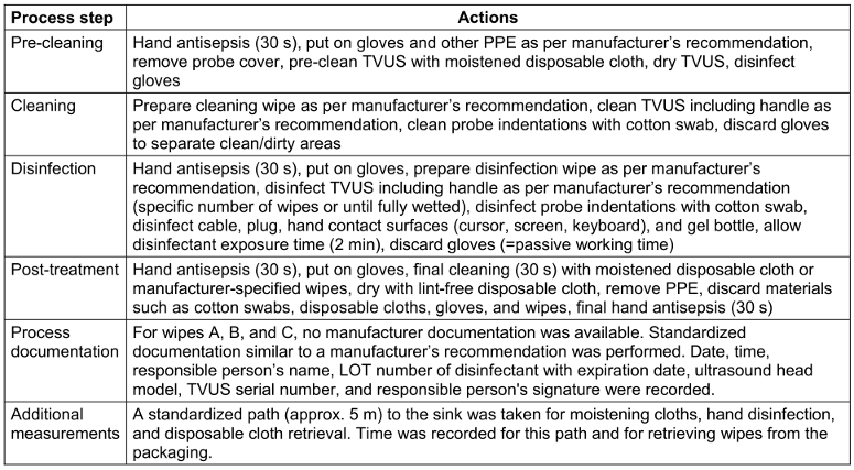 For manual wipe systems, the same process steps detailed in the recommendation of the Commission for Hospital Hygiene and Infection Prevention at the Robert-Koch Institute Berlin (KRINKO) and the Federal Institute for Drugs and Medical Devices (BfArM) [2] were always simulated to standardize time measurements (Table 2 [Tab. 2]). Intermediate rinsing was omitted, as manufacturers stated that disinfection was adequate without it.