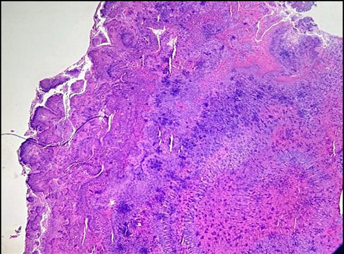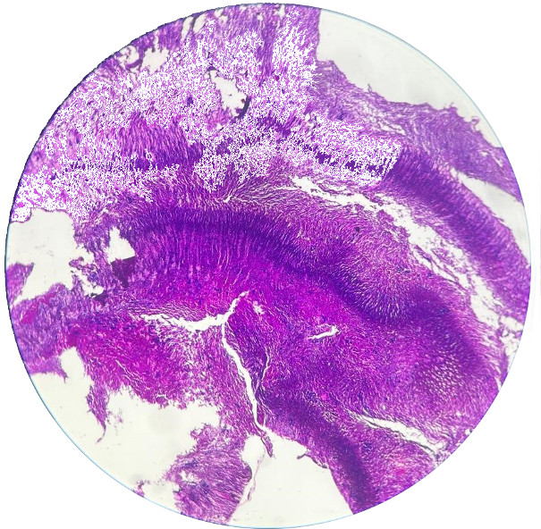Figure 2: Actinomycotic sulphur granules (H&E;40x)