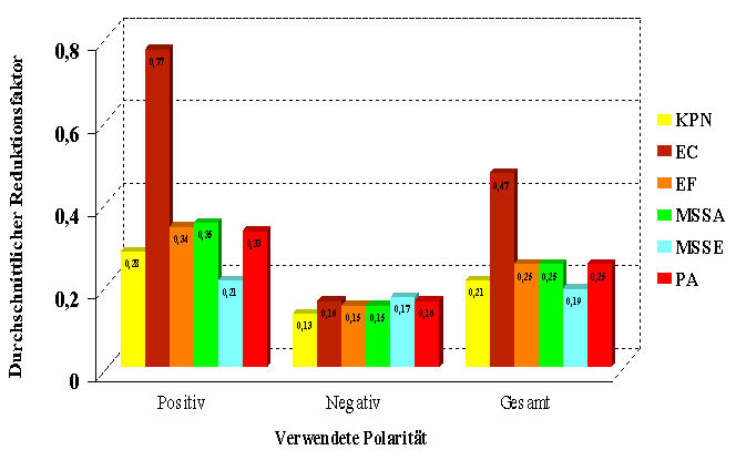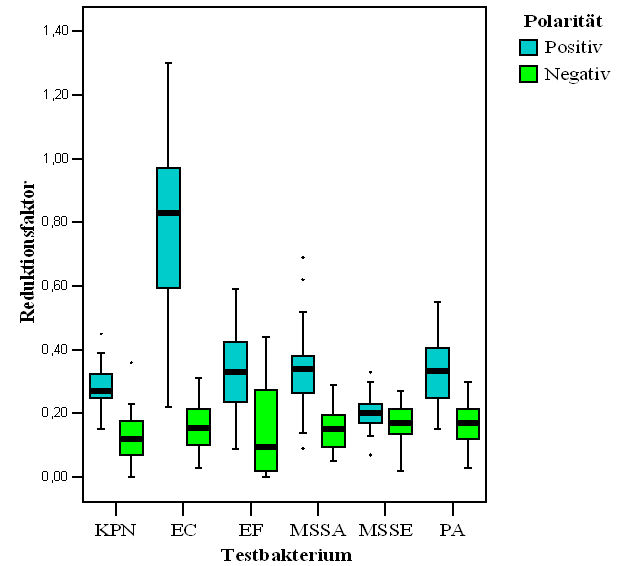 - Die stärkste Reduktion wurde gegenüber E.coli (mittlerer RF 0,8), die geringste gegenüber MSSE (mittlerer RF 0,2) ermittelt.