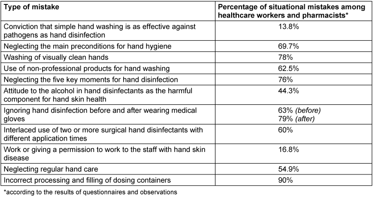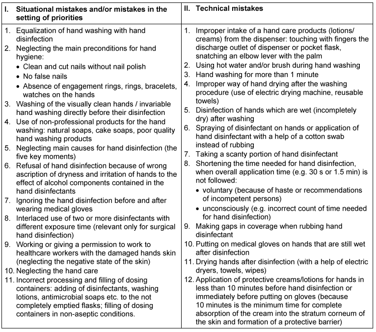 The low level of compliance with hand hygiene among health care and pharmaceutical workers became a valid reason for detection and systematization of the major mistakes that cause violation of the rules and guidelines of the proper hand hygiene (voluntary and unconscious noncompliance).