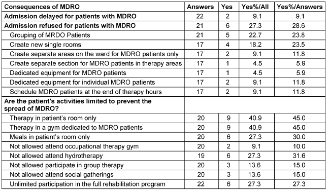 When MDRO patients were admitted, the most common measures were cohorting, therapy with dedicated equipment, therapy in dedicated sections or at the end of the day. Almost half of the facilities performed therapies in the patient´s room or in special therapy rooms, more than a quarter of the facilities prohibited eating in the dining room and hydrotherapy, and more than 10% excluded MDRO patients from participating in group therapy or in social gatherings. Only a quarter of the facilities enabled unlimited participation in the full rehabilitation program.
