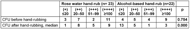 Table 1: Comparison of the colony count before and after hand-rubbing with alcoholic hand-rub and rose water