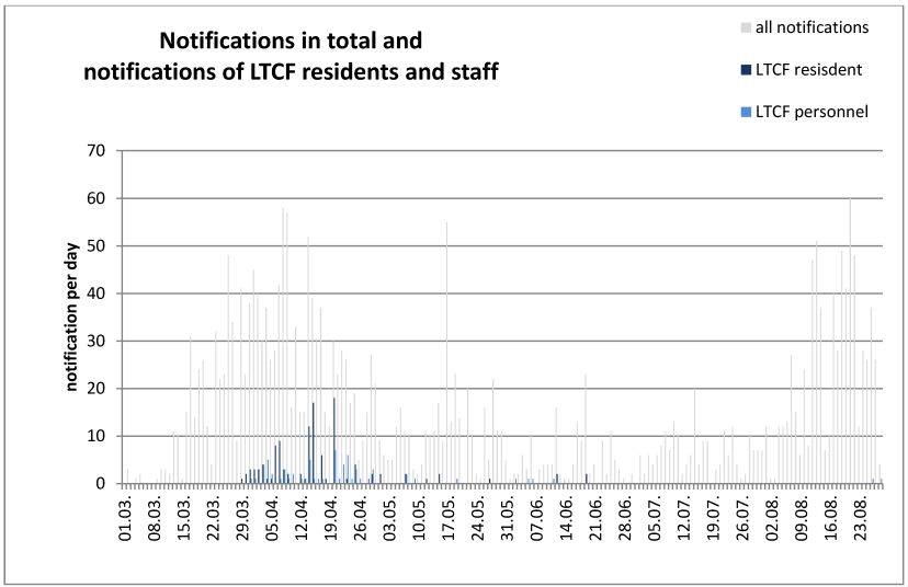 Two points are also noteworthy: In 22 other LTCFs in Frankfurt am Main, isolated cases of COVID-19 were described among residents or employees, but the measures taken prevented wider spreading in these homes. The remaining 20 homes reported neither residents nor employees as infected with SARS-CoV-2, even though extensive tests were carried out in April 2020.