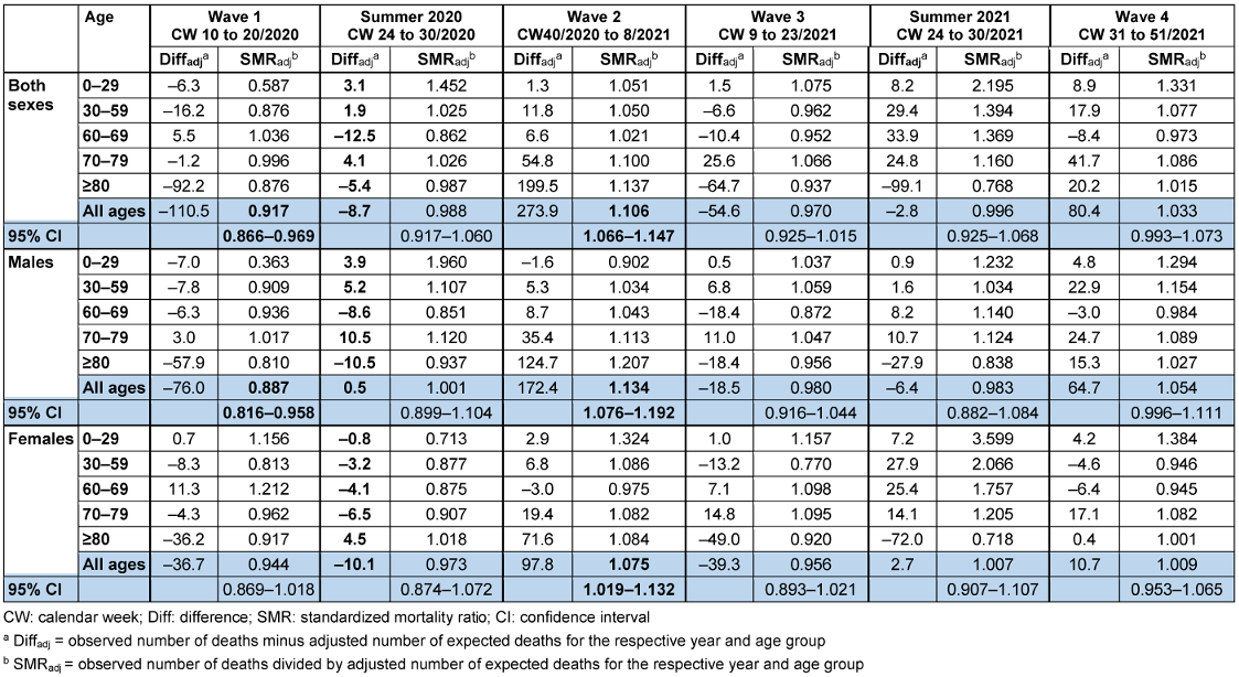 This procedure to estimate SMRadjusted was applied to all single waves and the intermediate phases (summer periods). Instead of whole years, only the calendar weeks of the respective waves (wave 1 to 4) and of the intermediate phases (between waves 1 and 2, and between waves 3 and 4) were taken into account. For wave 2, which lasted from CW 40/2020 to CW 8/2021, age-specific mean mortality rates were calculated by using the respective population on 31 December 2020.