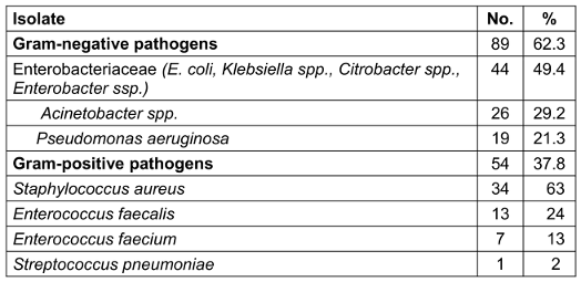A total of 143 significant bacterial isolates was obtained from 131 specimens. 29 coagulase-negative staphylococci and 4 corynebacterium species were excluded as common contaminants, due to its absence in repeated samples. The majority (62.2%) were Gram-negative organisms, i.e., 44 (49%) Enterobactericeae, 26 (29.2%) Acinetobacter spp., followed by P. aeruginosa with 19 (21.3%). Of 54 (37.8%) Gram-positive organisms, 34 (63%) were S. aureus.