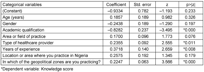 Table 3 [Tab. 3] presents the binomial logistic regression analysis indicating the impact of various socio-demographic factors on the level of knowledge regarding monkeypox in Nigeria and identifies key determinants of knowledge in healthcare workers. From the logistic regression results, age (p-value=0.233), gender (p-value=0.326), academic qualification (p-value=0.197), area of practice (p-value=0.076), and location of practice (p-value=0.179) have no effect on the knowledge of monkeypox in Nigeria, which signifies that these factors are not associated with differences in knowledge levels among respondents. The findings also reveal academic qualification (p-value=0.000), type of healthcare provider (p-value=0.011), years of experience (p-value=0.008) and geopolitical zone of practice (p-value=0.000) to have a strong influence or impact on the knowledge levels of HCWs about monkeypox in Nigeria.