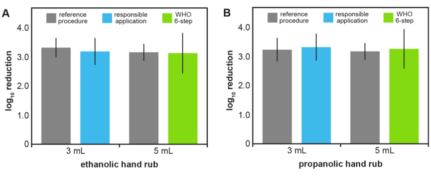 Shown are means (columns) and standard deviations (error bars) of log10 reductions in EN 1500 tests with 20 volunteers. Ethanolic (A) and propanolic hand rubs (B) were tested using 3 mL for the “responsible application” (blue) and 5 mL for the WHO 6-step method (green) for 15 seconds. The reference procedure (grey) was not modified from EN 1500 and used 2x3 mL of 60% isopropanol for 2x30 seconds.