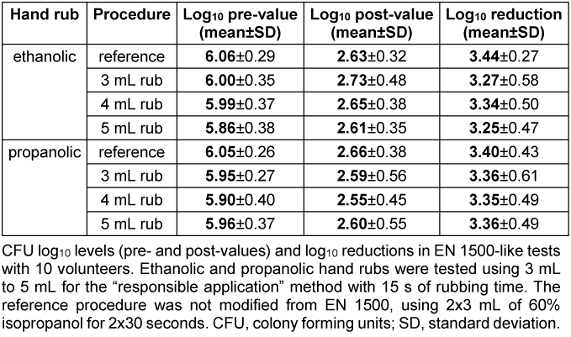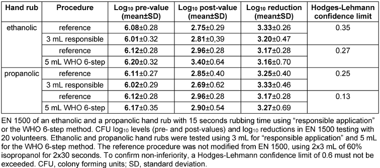 With recommendations to reduce rubbing times to 15 seconds becoming more common in clinical practice, we investigated whether ethanolic and propanolic hand rubs could meet the unmodified efficacy requirements of EN 1500, the baseline for professional hand rubs, in 15 seconds instead of 30 seconds using “responsible application” and/or the standard EN 1500 rubbing procedure.