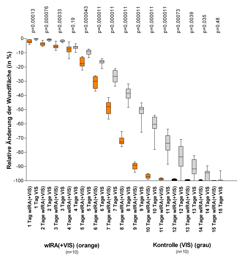 (dargestellt mit Minimum, 25%-Perzentile, Median, 75%-Perzentile und Maximum (Box-Whiskers-Darstellung; die Box repräsentiert die Interquartil-Spanne), adaptiert aus [2]). Die Abbildung präsentiert die Daten von den 10+10 = 20 Kindern (von 21+24 = 45 Kindern), die Verbrennungen vom Grad 2a (nicht 2b) hatten und die folglich bis zum kompletten Wundschluss konservativ einschließlich Bestrahlung (beginnend am Tag der Verbrennung bis zum kompletten Wundschluss) mit wIRA(+VIS) oder nur mit VIS (Kontrollgruppe) behandelt wurden. Patienten in der Gruppe mit wIRA zeigten eine deutlich schnellere Abnahme der Wundfläche verglichen mit der Kontrollgruppe: eine Abnahme der Wundfläche im Median um 50% wurde in der Gruppe mit wIRA bereits nach 7 Tagen verglichen mit 9 Tagen in der Kontrollgruppe und eine Abnahme der Wundfläche im Median um 90% wurde in der Gruppe mit wIRA bereits nach 9 Tagen verglichen mit 13 Tagen in der Kontrollgruppe erreicht.