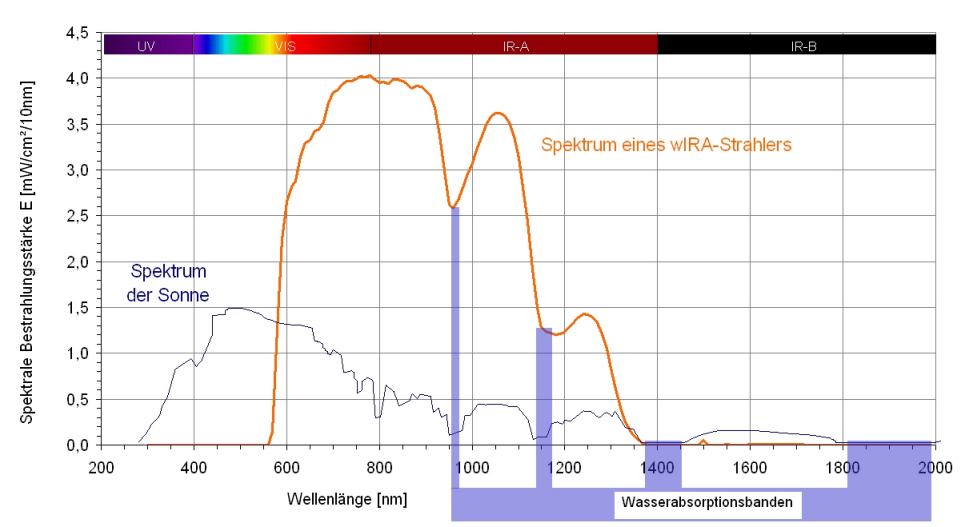 Spektrale Bestrahlungsstärke der Sonne auf der Erdoberfläche auf Meereshöhe (mit der Sonne am Zenith und bei mittlerem Erde-Sonne-Abstand) (aus [1], adaptiert aus [58]) und spektrale Bestrahlungsstärke eines wIRA-Strahlers (Hydrosun®-Strahler 501 mit 10 mm Wasserküvette und Orangefilter OG590) bei ca. 210 mW/cm² (= 2,1 · 10³ W/m²) Gesamtbestrahlungsstärke (adaptiert aus [1], [4]). Das Spektrum der Sonne auf Meereshöhe umfasst Ultraviolett-Strahlung (UV, <400 nm), sichtbares Licht (VIS, 380–780 nm) und Infrarotstrahlung (IR, >780 nm). Das Spektrum des wIRA-Strahlers umfasst nur sichtbares Licht (VIS) und Infrarotstrahlung (IR); der sichtbare Teil hängt vom verwendeten Farbfilter ab; der wIRA-Strahler emittiert keine Ultraviolett-Strahlung (UV). Beide Spektren zeigen die verminderten Bestrahlungsstärken im Bereich der Wasserabsorptionsbanden.