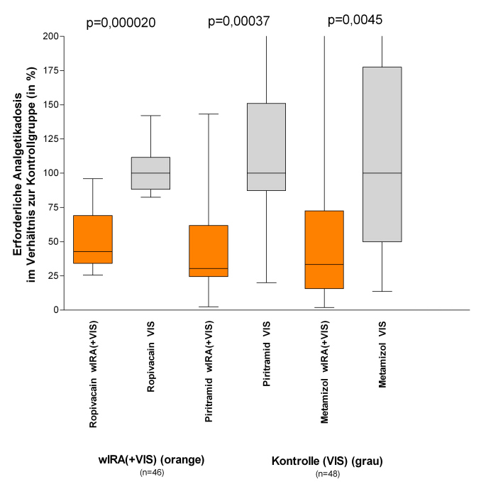 Die erforderliche Analgetikadosis war in den Untergruppen mit wIRA(+VIS) 52–69% niedriger (mediane Differenzen) im Vergleich zu den Kontrolluntergruppen mit nur VIS (Median 598 versus 1398 ml Ropivacain, p=0,000020, für Peridural-Katheter-Analgesie; 31 versus 102 mg Piritramid, p=0,00037, für patientenkontrollierte Analgesie; 3,4 versus 10,2 g Metamizol, p=0,0045, für intravenöse und orale Analgesie, siehe Abbildung 7 [Abb. 7]).