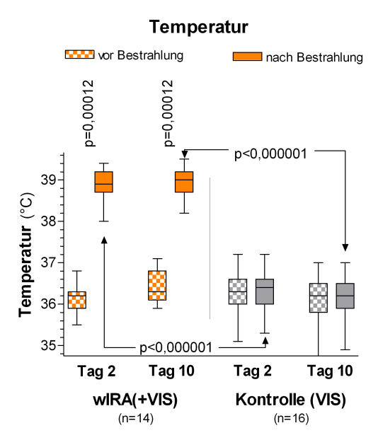 (dargestellt mit Minimum, 25%-Perzentile, Median, 75%-Perzentile und Maximum (Box-Whiskers-Darstellung; die Box repräsentiert die Interquartil-Spanne); adaptiert aus [2], [19]). Während der Bestrahlung mit wIRA(+VIS) stieg die subkutane Temperatur deutlich um ungefähr 2,7°C an, während sie in der Kontrollgruppe unverändert blieb.
