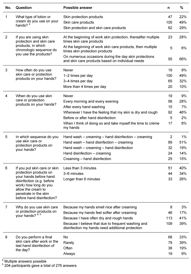 Es wurden 250 Fragebögen verteilt. 49% der Antwortenden gaben an, Hautpflege mindestens 1–2 mal täglich durchzuführen. 40% der Befragten gingen davon aus, dass die Dauer zum Einziehen von Hautcreme weniger als 3 min beträgt.