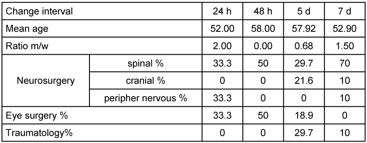 Basic demographic and medical data are presented in Table 1 [Tab. 1]. Mean age over all groups was 56.6 years. Most participants were neurosurgical patients, typical indications for surgery being disc prolapses, spinal or cranial tumors. Age and type of surgery were pretty homogenous between groups.