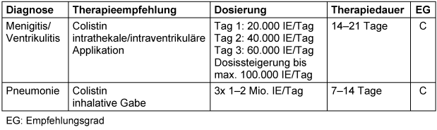 Colistin erreicht bei systemischer Gabe nur niedrige Konzentrationen im Lungengewebe, so dass eine additive inhalative Therapie bei Pneumonie erwogen werden kann [63].