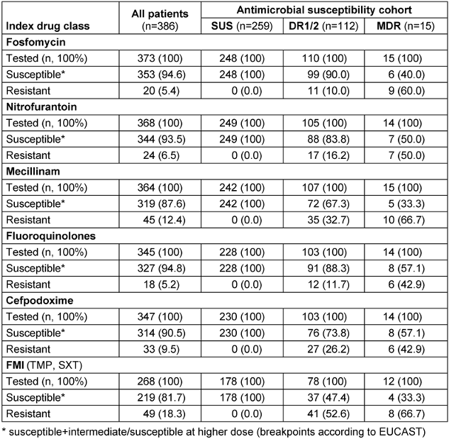 Treatment for uUTI failed for 8.8% of patients; failure was more likely in MDR versus SUS [adjusted odds ratio [95% CI]=4.21 [1.14–1.50]; P=0.031); incidence of recurrent infection in the 6-months post-index period was higher in DR1/2 versus SUS. These findings may have implications for empiric prescribing, suggesting an unmet need for new treatments [53].